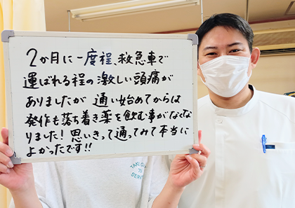 2か月に一度程、救急車で運ばれる程の激しい頭痛がありましたが通い始めたからは発作も落ち着き薬を飲む事がなくなりました!