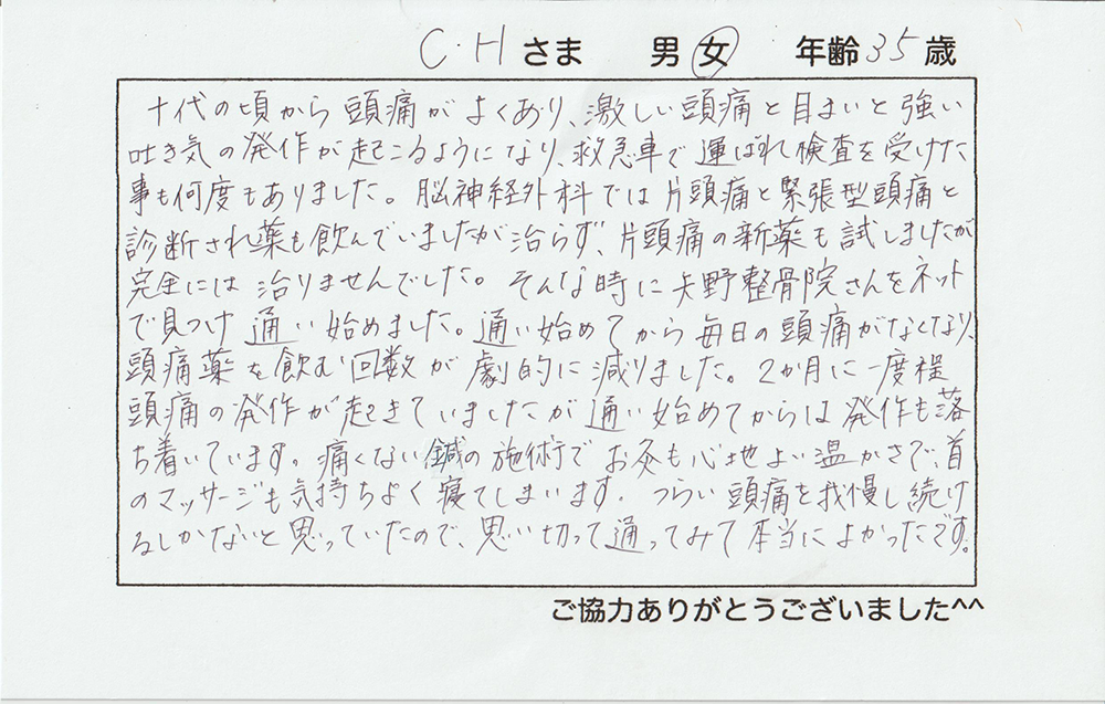 2か月に一度程頭痛の発作が起きていましたが通い始めてからは発作も落ち着いています。
