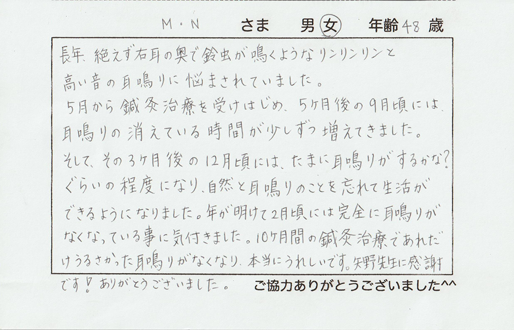 10ヶ月間の鍼灸治療であれだけうるさかった耳鳴りがなくなり、本当に嬉しいです。