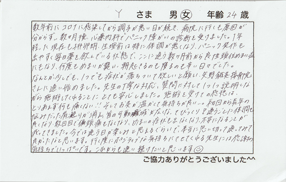 1年経った現在も排卵期、生理前は特に体調が悪くなり、パニック発作も出やすく毎日薬を飲んでいる状態で、ここに通う数ヵ月前から良性頭位めまい症にもなり、何度もめまいが襲い、朝起きるのも寝るのも辛い日々でした。